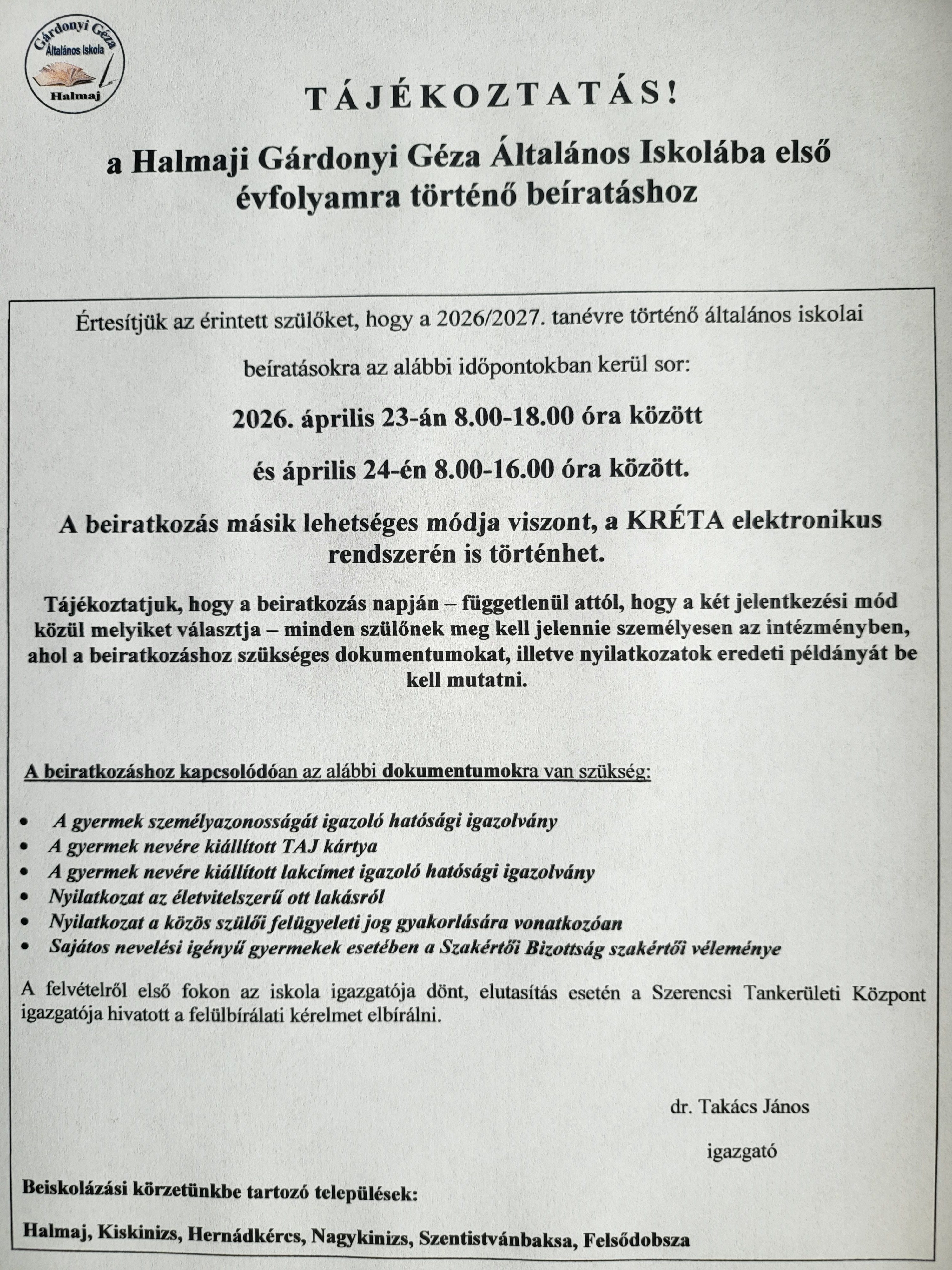 Értesítő a Klebelsberg Intézményfenntartó Központ Szikszói Tankerülete fenntartásában működő általános iskolákba történő beíratásra.